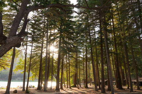 the property is a truly unique treasure. a clash of northern and Southern California landscapes open up to a valley filled with redwoods and oaks. a swimming dock gives guests access to the lake, along with private patios for sunbathing. beyond the cabin accommodations, there are staff quarters, a club house called the ranch house, horse corrals, a large geodesic dome and spaces to accommodate limitless activities.